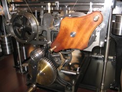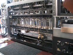 The printer has actually been used to print — we got to see a page with two neat columns of numbers that looked quite nice — but it apparently takes something like two hours to clean the goopy ink out, so this time it was running ink-free. The sort of curvy gold colored tray is where the ink is poured, and where the roller emerges out of, to touch the metal segments which present the numbers of the calculated answer.