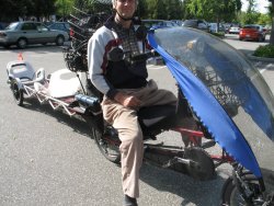 As I left the display hall I noticed what I first thought was a recumbent bicycle with, curiously enough, a trailer with two seats on it, and what looked like a Persian carpet for footing. Closer investigation revealed it to be an electric recumbent bike, and its owner/creator was quite happy to invite me and one of my friends for a ride around the parking lot! Here’s a close-up of the bike itself and its owner, Mike.