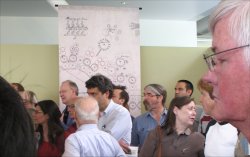 Many intrigued computer geeks in front of a banner of the Analytical Engine plans