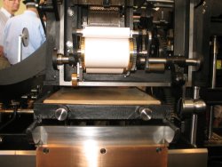 Below and tucked back behind the shiny-clean ink roller you can just see the segmented roller of numbers. Hanging a little below the ink roller is the paper roll, and below that is the front tray (currently empty) for the plaster mould imprinting. All three pieces swing and lift and roll smoothly, neatly weaving in and out with each other like clockwork. It’s amazing to see, and “still” photos just don’t do this lovely Engine and printer justice.