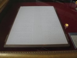 This is the first full mould produced by Difference Engine No. 2. The engine impresses results on soft material, in this case, Plaster of Paris. Such molds, called stereotype molds, were used in the 19th century to produce printing plates for use in a printing press. This mold is experimental. The alignment of the numbers and the line heights appear to be erratic. The experiment was used to make adjustments to reduce these irregularities.